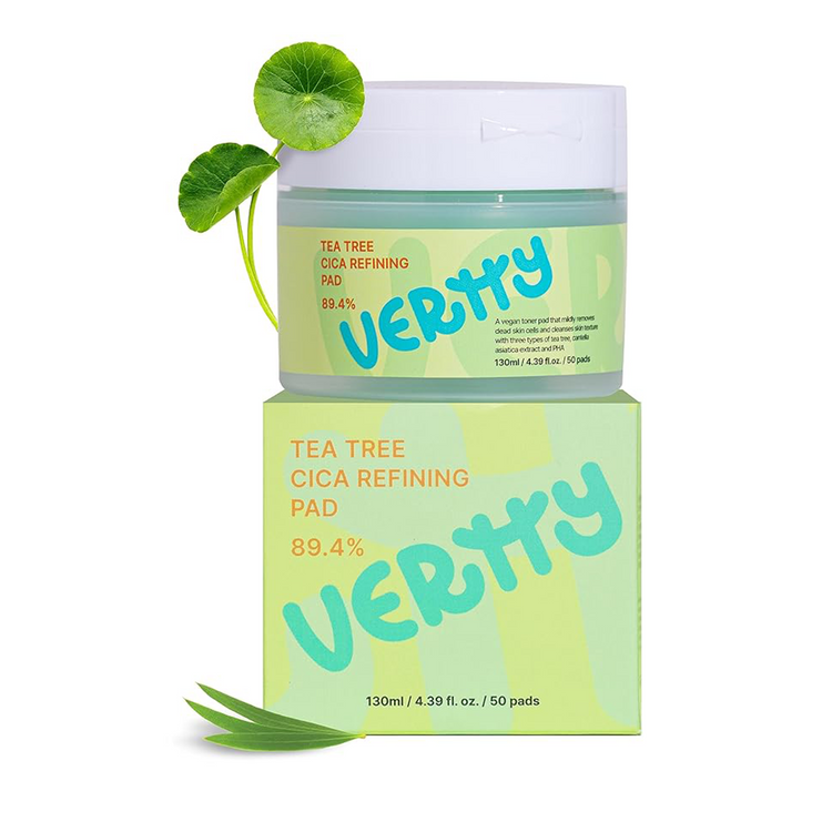 Los VERTTY Tea Tree Cica Refining Pad son almohadillas tónicas diseñadas para calmar, hidratar y renovar la piel en un solo paso. Su fórmula contiene un 89.4% de extracto de centella asiática, ideal para reducir la irritación y fortalecer la barrera cutánea.